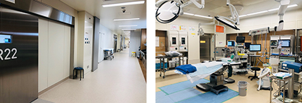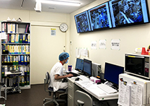 麻酔部所属の医師は、中央棟の3Fと4Fにある計18室、新外来棟にある4室の手術室、術後回復室、術前診察室をカバーしています。小児・成人の心臓手術、脳血管カテーテル治療、血管ステント手術、胸腔鏡下肺手術、腹腔鏡手術、頭頸部外科手術などが比較的多いのが特徴です。ここでのトレーニングで、麻酔科専門医に必要な麻酔手技は網羅できます。